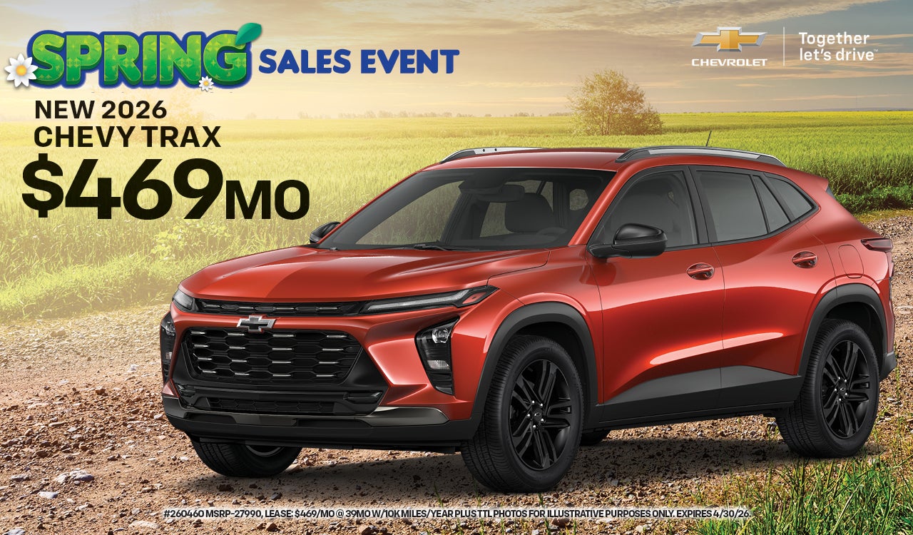 New 2026 TRAX $469/mo #260460 MSRP-27990, LEASE: $469/MO @ 39MO W/10K MILES/YEAR PLUS TTL Photos for illustrative purposes only. Expires 4/30/26.